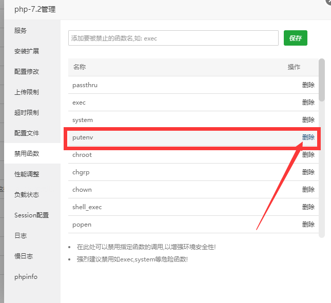 解決以上問題,只需要進(jìn)入寶塔面板后臺。選擇“軟件商店”,找到已安裝對應(yīng)的php版本,在右側(cè)選擇“設(shè)置”——“禁用函數(shù)”,在禁用函數(shù)列表中找到“putenv”刪除,最后重啟php即可。