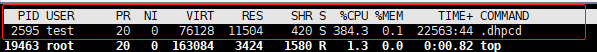 可以清楚的看到第一行:USER:test cpu飆至384%,進(jìn)程名字:.dhpcd