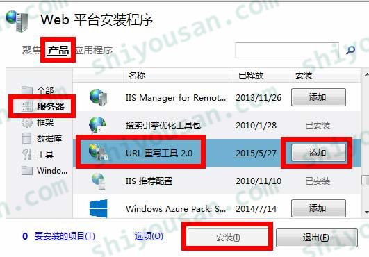 在Web平臺安裝程序中選擇產(chǎn)品》服務(wù)器,在列表中找到URL重寫工具,點擊添加后點擊安裝,即可自動安裝好!如下圖: