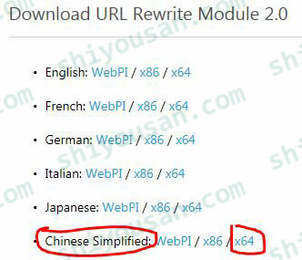 另外一種方式是下載離線安裝包,下載地址在頁面靠近底部的Download URL Rewrite Module 2.0區(qū)塊。不過要選擇對應(yīng)自己網(wǎng)站服務(wù)器的版本,比如筆者的服務(wù)器是64位,中文簡體,就要選擇如圖所示的版本: