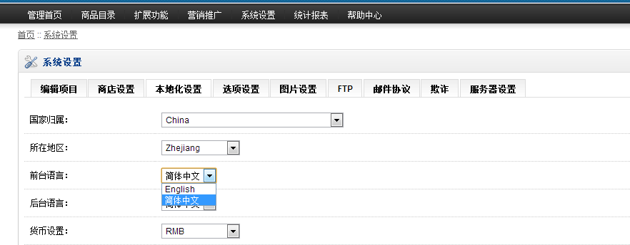 進(jìn)入Opencart的后臺-->系統(tǒng)設(shè)置--->參數(shù)設(shè)置--->語言設(shè)置
