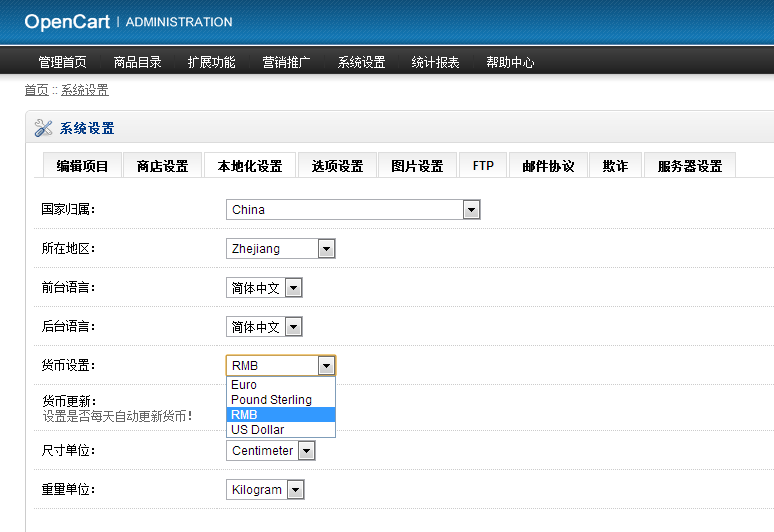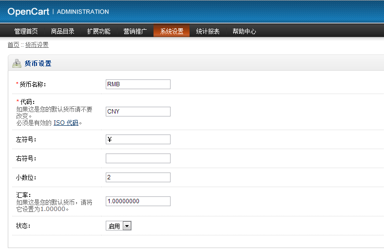 進(jìn)入Opencart的后臺-->系統(tǒng)設(shè)置--->參數(shù)設(shè)置--->貨幣設(shè)置